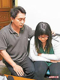 女店员(右)昨在新竹县议员陈栢维陪同下,控诉被警员当重刑犯上手铐脚镣。图片来源:台湾《苹果日报》