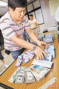 警方起出本票、账册、台币、美金、港币合计约一千万元赃款。图片来源:台湾《苹果日报》