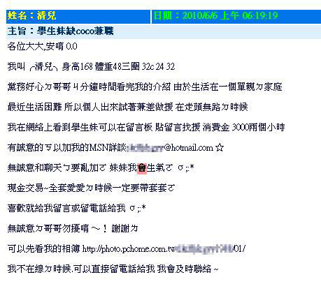 据报道,来到高雄县教师会网页,点进留言板流览,为人师表的空间怎么会有一则“援交”广告?广告上头不但自称是大二学生,还“男女不限”,因为缺钱,希望大家“援助”。