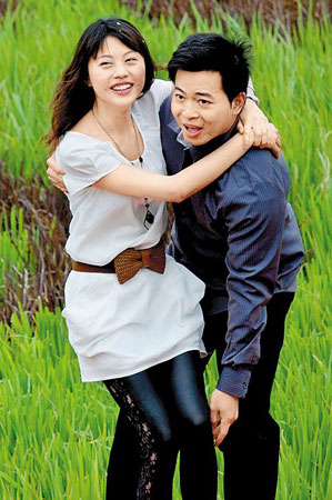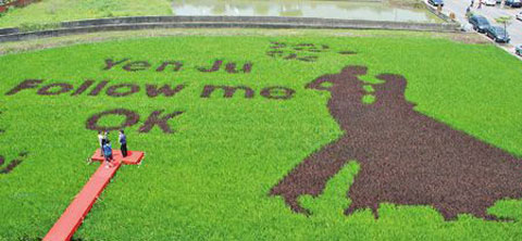 据台湾《中国时报》报道,在苗栗一纸厂上班的张家玮,为向交往多年的女友廖研如求婚,3月初偷偷委托苑里镇农会利用紫色秧苗在稻田上彩绘“Yen Ju,Follow me OK”字样及图腾,6日中午张家玮带不知情的女友到场上演求婚大作战,女友感动落泪深情拥吻,同意将携手共度一生。