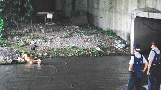 赖姓游民在溪中洗澡时滑倒,泡在水中数日,他养的两只狗一直守在旁边,警方据报有“浮尸”,赶到抢救。图片来源:联合报