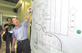 警方公布黑道角头枪击案相关录像画面,图为台中市第一分局刑警队队长杨春贤说明命案发生时,四名官警在场位置与歹徒枪杀时相关示意图。图片来源:联合报