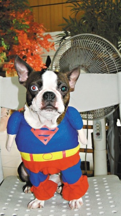 宠物狗“大目仔”爱穿超人装。图片来源:联合报