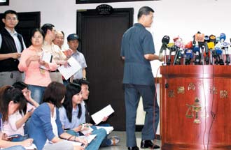 陈水扁等人涉及的公务机要费等案二审宣判后,二审法院发言人陈晴教(右)出面对媒体说明判决结果。图片来源:台湾《中国时报》