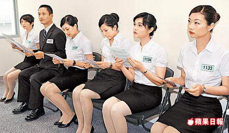 台湾华航招募空服员,应试者须以英语朗读服务广播词,考生上场前把握时间练习。 来源:台湾《苹果日报》