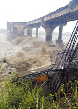 后丰大桥是台中县丰原市的交通要道,也是后里乡民对外联络主要道路。前年9月因“森拉克”台风来袭,桥墩被冲毁,桥面断裂,有6人丧生,并获赔偿。
