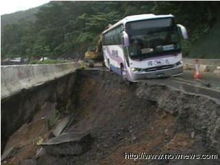 报道称,连日大雨,台湾南回公路450公里的森永路段,路基被大雨冲刷掏空。28日凌晨,一辆载有13名乘客的客运车险些因此坠谷,幸好司机林宝成发现路面有异,紧急剎车才未造成人员伤亡。不过,为闪躲对面驶来的车辆致该客车身严重倾斜,右前轮甚至悬空在洞内。