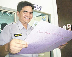 宜兰县警员看到学生们写得满满的“感谢卡”非常感动。图片来源:台湾《中国时报》