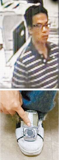 何嫌犯(上图)将手机设定录像功能,放到鞋带内绑好固定(下图),随机挑选女子偷拍裙底风光。