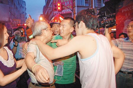 火灾时4楼的廖姓房客(左二)迟迟没逃出,林姓房东(中间绿衣者)坚持在2楼楼梯间等他,直到被消防队以安全为由强行拉下楼,才发现房客已从隔壁栋安全逃出,2人相见情绪激动相拥而泣。 来源:台湾《中国时报》