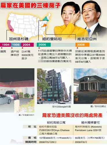 依美国资料,陈水扁家在纽约市近曼哈顿八大道闹区的豪华公寓,售价157万5千美元(约台币5000万元),在2008年5月29日购买;在弗吉尼亚要价55万美元(约新台币1760万元)的独栋住宅,在同年6月购得。