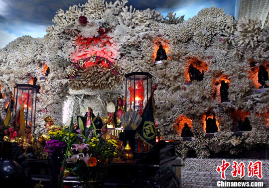 进入7月中下旬的台湾富福顶山寺游客大增。这座寺庙位于三芝乡横山山上,据说是一位信徒从1996年起用上百种珊瑚与六万多种贝壳堆砌而成,故又称贝壳庙。此庙主奉祀济公活佛和十八罗汉与圣母娘娘。庙堂建筑特别,色彩斑斓,犹如“海底世界”,慕名而来的香客游人络绎不绝,香火旺盛。中新社发 宋吉河 摄