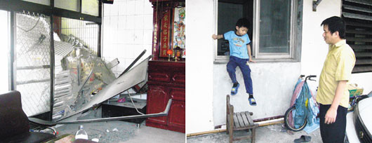 林基全说,昨天凌晨两点“碰”一声,他下楼查看,一楼铁门和落地窗被撞毁,门已经打不开,须爬窗子出去,“一看傻眼,散落一地的水泥有一、二百包”。