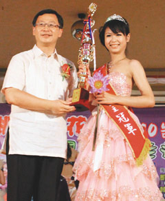 桃园县长吴志扬(左)颁发冠军奖座给第二届桃园莲花公主第一名张以欣(右)。图片来源:联合报