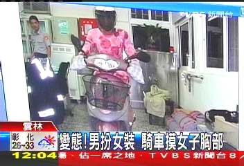 据台湾TVBS电视台报道,台湾云林县一名变态男子男扮女装,身着粉红玫瑰洋装、丝袜高跟鞋,骑车袭击女子胸部被抓获。