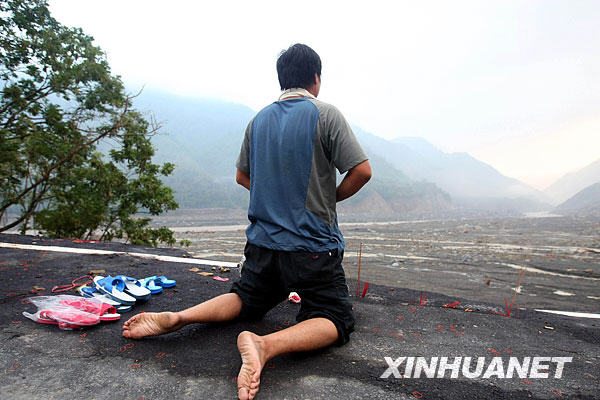 资料图:2009年8月15日,一名遇难者家属在被泥石流淹没的小林村前祭奠。新华社发