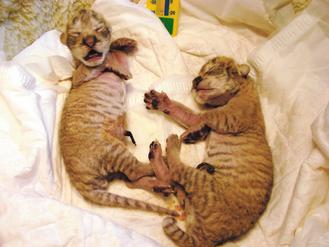 黄国男说,母虎似乎很怕幼子,离得远远的,没有哺乳意愿,他赶紧到笼内把二只狮虎抱出来,用吹风机及保温灯为失温的狮虎保温。存活的狮虎一公一母,状况看起来还不错。因母虎不哺喂幼子,农场将采人工喂奶,希望小狮虎顺利长大。(中国台湾网 陈佳慧)
