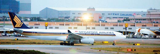 乌克兰籍货机7月15日从桃园机场离场时,因机长抄收塔台指示错误,与正要起飞的新加坡航空客机差点相撞。(台湾《联合报》资料图)