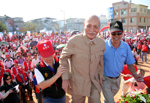 酷似蒋介石的李登科,成为台湾吸引大陆观光客的新武器。图为李登科(中)2009年在金门为县长参选人李沃士辅选时,民众争相目睹他风采的情形。图片来源:“中央社”