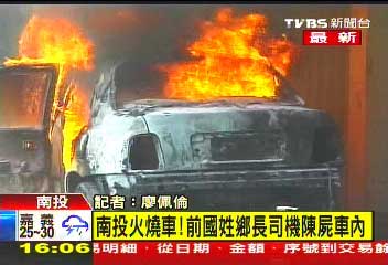 中国台湾网9月10日消息 据台湾TVBS电视台报道,台湾南投县国姓乡发生一起轿车着火事件,一名男子陈尸车内,经南投县消防警察确认,死者是台南县前国姓乡乡长司机。