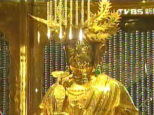 中国台湾网9月17日消息 据台湾TVBS电视台报道,近日,随着台湾金价飙升,台中县镇澜宫的纯金妈祖神像价值比7年前翻了近3倍已,达3亿4000万(新台币,下同)。镇澜宫方面担心黄金妈祖被盗,做了多项防盗措施。