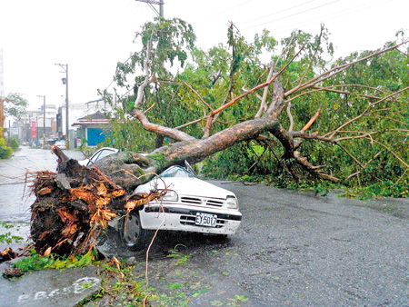 “凡亚比”台风威力惊人,将路树连根拔起,压毁停在一旁的车辆,幸无人伤亡。来源:台湾《中国时报》