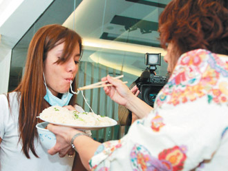 莎莎(左)22日返台,母亲赶紧送上猪脚面线压惊。 来源:台湾《联合报》
