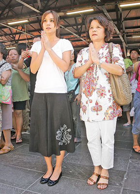 莎莎(左)与母亲到行天宫拜拜,她祈求中弹的柯强尽快平安回台。来源:台湾《中国时报》