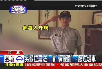 中国台湾网10月9日消息 据台湾TVBS电视台报道,“五都”(台北县升格后的新北市、台北市、县市合并后的大台中市、大台南市和大高雄市)选战进入倒计时阶段,市议员参选人抓住最后时机,拼人气抢选票,绞尽脑汁用尽各种办法跟选民拉近距离。有的参选人忧虑自己知名度不够,索性自导自演影片,剧本跟拍摄手法媲美偶像剧,很有质感,借此来拉拢年轻选民;有的参选人则跟着垃圾车拜票,哪里有人就往哪里去,到人群集中的地方拉选票。