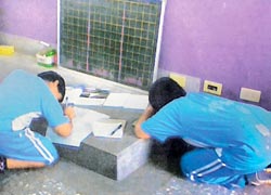 台中县某小五年级老师被学生家长爆料,强迫学生跪地写字,老师辩称只是让孩子蹲着,家长出示以手机录下的证据,显见孩子跪在讲台写作业。图片来源:台湾《中国时报》