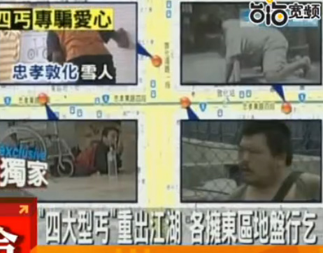 中国台湾网10月21日消息 据台湾中天电视台报道,一直被台媒及台湾网友热炒的台北东区“四大型丐”近日再现江湖,绰号为“雪人”、“摇头”、“达摩”、“皇帝”的4名“乞丐”在台北东区形成4大“丐王”的局面,他们各自拥有固守地盘,各有标志性的装束及“病因”,假装身有残疾乞讨。虽然4人已被列为警方特别管制对象,当仍然阻挡不了他们行乞,阻挡不了“皇帝”“乞丐”月收入近10万(新台币,下同)的可观收入。