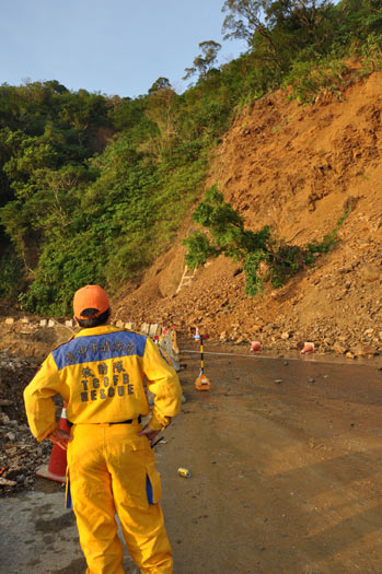 苏花公路106公里处25日凌晨大面积坍塌,抢救进度从115公里倒退至106公里,抢通进度严重受堵。图为消防人员现场勘察坍塌状况。图片来源:“中央社”