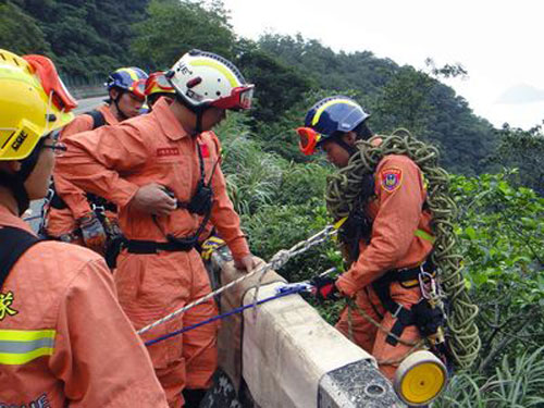 台北市搜救队24日挺进苏花公路116公里塌方处,搜救队员从陡峭山壁垂降,搜寻生还者及车辆残骸。图片来源:“中央社”