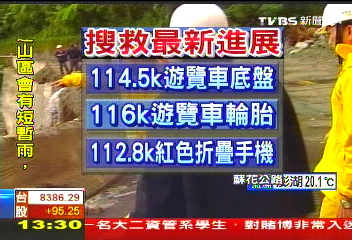据报道,救援人员在苏花公路112.8公里处找到一支红色折叠手机,但由于电池已经耗损,所以无法确认手机的拥有者。不过手机上的维修标签是繁体字,可能是失联的台湾人士所有。