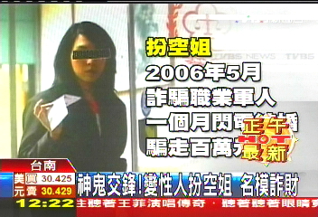 日前,变性人被台南市地方法院逮捕,判刑1年3个月。法官表示,这名变性人犯案累累,她曾假扮空姐、检查员等诈骗多名男子。变性人曾以美人计,同时周旋在4名痴情男之间。(中国台湾网 冯存健)