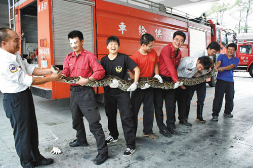 据台湾《联合报》报道,台湾民众3日下午在屏东县东港溪畔发现一条大蟒蛇,当地消防队员过去只有捕小蛇经验,头一回遇到逾4米、重40公斤的巨蟒。6名队员花了半小时制伏,顺利捕捉它。