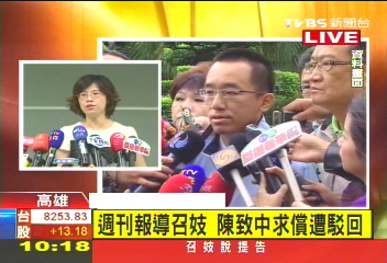陈致中一直不满《壹周刊》报道他疑涉召妓,今年7月26日向高雄市地方法院提告《壹周刊》损害名誉,要求恢复名誉和求偿新台币200万元。