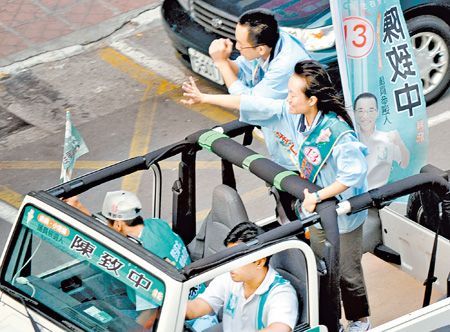 陈致中、黄睿靓夫妇16日下午仍率车队游街拜票。 来源:台湾《联合报》