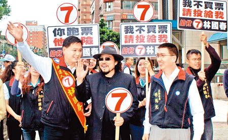 台湾综艺大哥大张菲(中)昨现身板桥,替市议员候选人林国春拉票。 来源:台湾《中国时报》