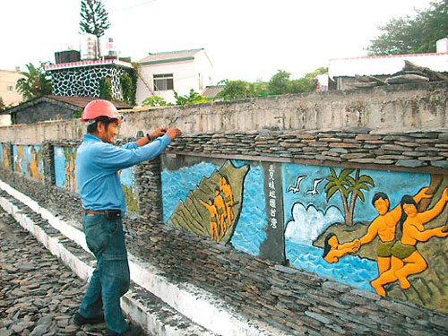 台东知本卡地布部落天主堂,为发扬卑南族人传说祖先是由“巨石”及“竹子”裂开所生,聘请部落石匠师父以“石板”堆砌卑南族传说故事,希望能将传统文化流传给后世族人。 图片来源:台湾《联合报》