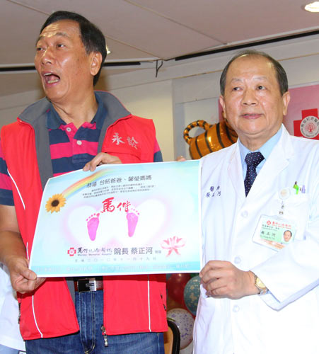 郭台铭(左)召开记者会宣布喜事,马偕医院院长蔡正河(右)送上宝宝的小脚印祝贺。图片来源:台湾“中央社”