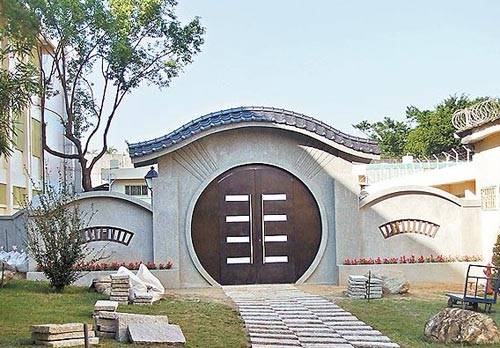 台中监狱附设培德医院的女受刑人重病区入口,有中式大门和围墙外观。