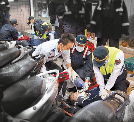 台北县中和市“金年春金仔店”银楼遭抢,两名嫌犯一人中弹(后)、一人猝死(前),警方在现场进行抢救。 来源:台湾媒体