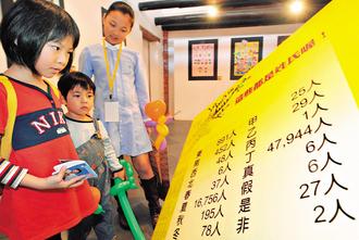 剥开族谱寻宝趣活动在艋舺剥皮寮举行,参观的小朋友有些特殊的字都不认识,更别说看过这些姓氏,站在统计表前,努力回忆。图片来源:联合晚报
