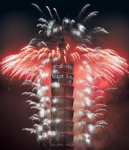 台湾将有七场大型跨年烟火,其中台北101大楼烟火是由蔡国强设计。图为今年元旦101大楼施放跨年烟火。