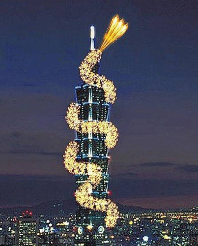 据台湾《苹果日报》报道,台北101大楼跨年烟火秀将于三十一日登场,台北101昨天(16日)首度公布烟火秀仿真图案,其中一款“祥龙盘旋”营造出一尾金龙随大楼建筑往上攀升、直到高五百零八米的塔尖处再喷出烟火的华丽壮观感觉,呈现台湾经济向上提升意向。烟火摄影达人建议,邻近的新光三越A11顶楼空中花园、松仁路都是不错的观赏点。