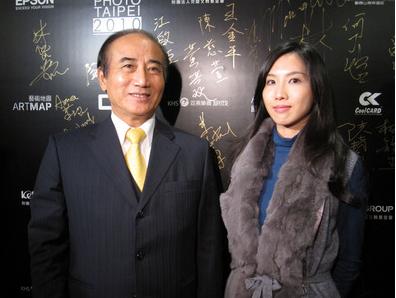 王金平 (左)16日出席“台北摄影与数字影像艺术博览会”开幕酒会,也为参展人的王金平女儿王馨敏(右)说,“有时候会偷拍爸爸,他45度角最好看。”图片来源:台湾“中央社”