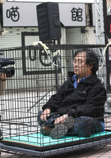 台湾动保人士黄泰山22日以自关狗笼禁食方式,呼吁民众正视犬猫繁殖充斥黑心非法问题,以认养代替购买,别成为黑心繁殖场帮凶。