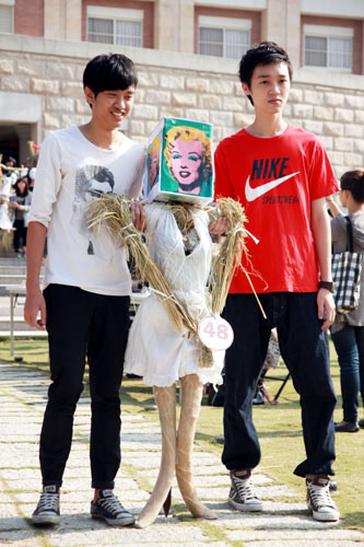 据悉,稻草人造型五花八门,有的扎成栩栩如生国际巨星迈克尔·杰克逊、玛丽莲·梦露、卡通人物超人等立体造型稻草人,还有色彩艳丽大胆的摇滚稻草人、造型俏皮的可爱稻草人,最后由视觉传达系1年级的学生林素瑄等人的“失落的世界”作品胜出,获得首奖。