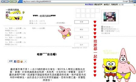 据台湾“今日新闻”报道,媒体日前曾报道一名初二女生遭霸凌,她被20多人拖到公园扒光衣服、煽巴掌,右耳甚至因此丧失听力。没想到,一名疑似在现场的青少女,事后竟然在部落格(博客)上讥讽该少女“被打到出名”,甚至用“破麻”形容对方。更因此在网络上与人对呛,自称“小四就离家,现年小六,日入10万”,经人肉搜索后被发现其实是17岁的中辍生。